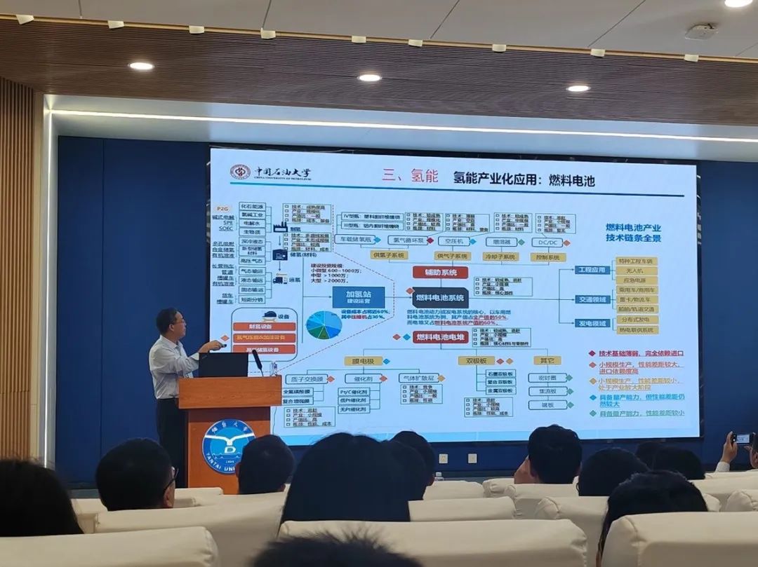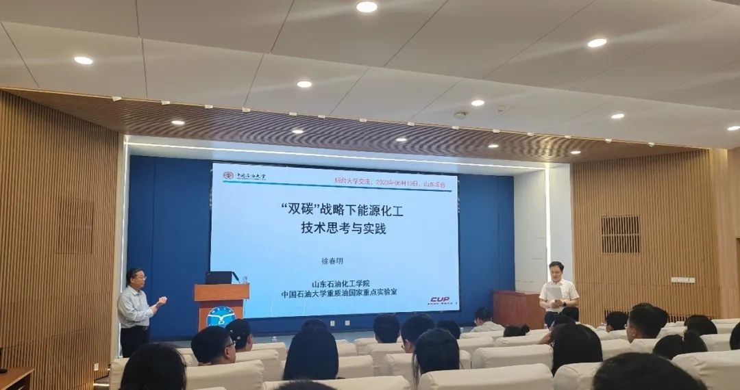 访问期间,徐春明院士作了题为《双碳战略下能源化工发展思考与实践》的学术报告,重点围绕“碳达峰、碳中和”国家战略目标,深刻分析石油化工学科与行业的发展趋势,详细介绍绿氢、绿电、储能等领域科技进展情况。化学化工学院百余名师生参加报告会。