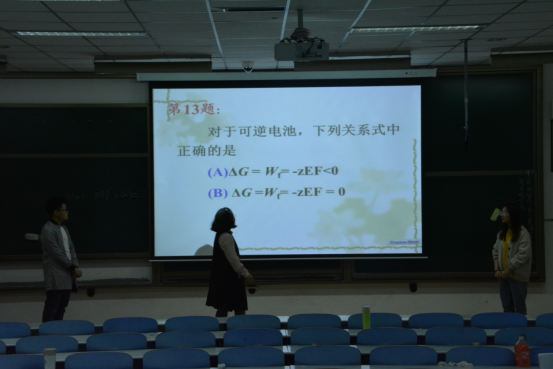 紧接着,物理化学教研组的孙逊老师通过自己的亲身经历为同学们介绍了自己对物理化学的认识和看法和物理化学的前景。之后,金明善老师介绍了本次活动的比赛规则及比赛流程,比赛流程分为三个环节,第一环节为老师出题,学生答题后亮题,答错淘汰,坐在两侧位置,第二环节为剩余人数少于10人时,进行复活环节,复活剩余10人及以下时剩余人为本届“物理化学挑战能手”,第三环节为继续答题,直至剩余1人,则为本届“物理化学挑战达人”。