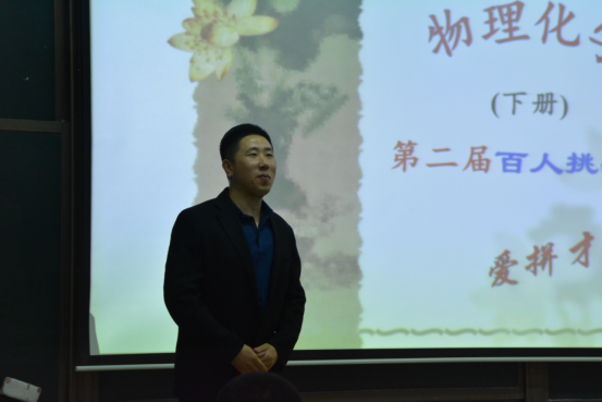 在比赛开始前,金明善老师邀请化153的郭志浩同学为17级同学加油。比赛现场,同学们满含热情,认真答题,认真思考,在金明善老师的带领下,参赛选手发挥自身真实水平,比赛题目更是接近生活,如“用清水洗完脸后,觉得脸有些绷紧,这说明人脸的表面张力比水的表面张力大或者小”。更是有轻松欢快的复活赛,优秀考研代表的考研分享,多种多样的出题模式,金老师秉承着给予学生更多锻炼机会,挑战自身的原则,让参赛同学有更多机会参与挑战赛,体验物理化学学科的乐趣与社会意义。