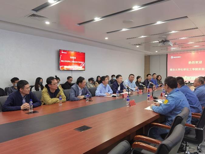 牟治林在欢迎致辞中热情回顾了双方的合作,感谢学校对企业的帮助。他表示公司目前有许多烟大化院毕业的学生,校企双方有良好的合作基础,未来可以加深交流,合作共赢。李文佐代表学院介绍了学院专业设置、师资队伍、学科科研等情况,并希望能与企业开展进一步的合作,在科技攻关、平台共建、人才培养等方面拓宽合作途径,希望企业能提前介入人才培养,通过共建专业、共建课程、人员共享等形式共同培养学生,为企业提供更优质的人才支撑。双方还就安全管理、人员培训等事宜进行了深入交流。