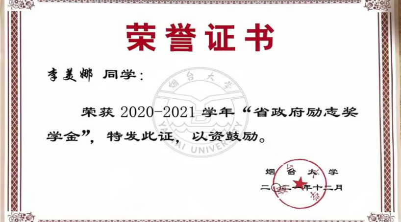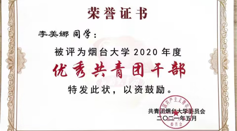 李美娜,曾任院团委采编部部长,现任化192-2团支部宣传委员,曾获2020-2021 学年“省级励志奖学金”、2019—2020 学年“优秀学生奖学金”,还积极参加科创比赛,获得奖项如下:第十七届“挑战杯”山东大学生课外学术科技作品红色专项活动省级二等奖、第九届大学生高分子材料创新创业大赛国家级三等奖、第二届山东省创新方法大赛省级一等奖、第十七届“挑战杯”山东省大学生课外学术科技作品竞赛省级二等奖、第十三届山东省大学生创业计划大赛省级二等奖、“大陆杯”第八届山东省高分子材料创新设计大赛省级三等奖、第七届91吃瓜