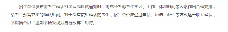 对于没有按时确认的考生,招生单位应通过电话、短信、邮件等方式逐一联系确认,不得简单以“逾期不接受视为自行放弃”对待。