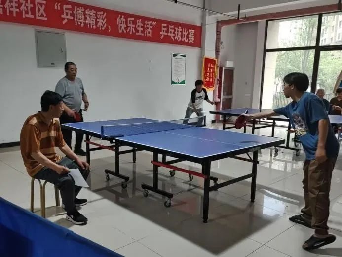 在嘉祥社区的乒乓球馆内,志愿者们与社区的中老年人们正进行着一场场活力四射的乒乓球比赛。