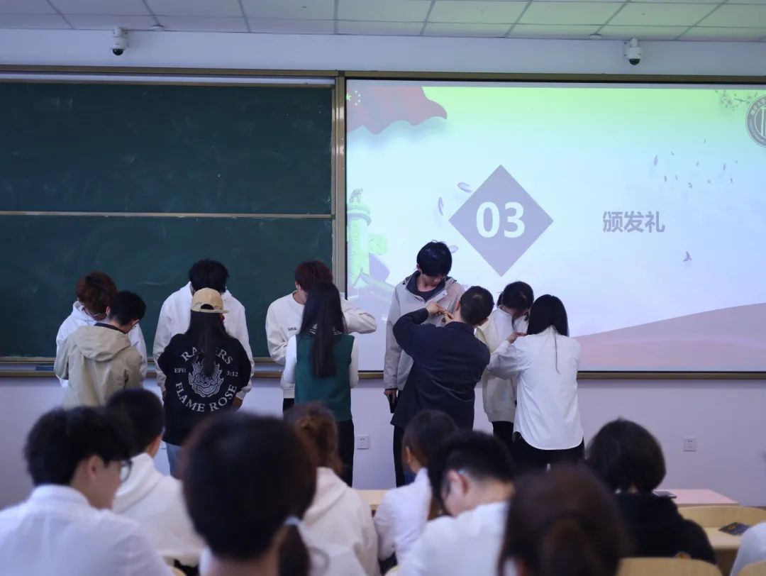 院团委辅导员老师们为新团员佩戴团徽、颁发团员证。之后,辅导员张成友老师对新团员寄予了殷切期望,希望他们能够以团员的标准严格要求自己,不断提升自己的政治觉悟、道德品质和文化素养。
