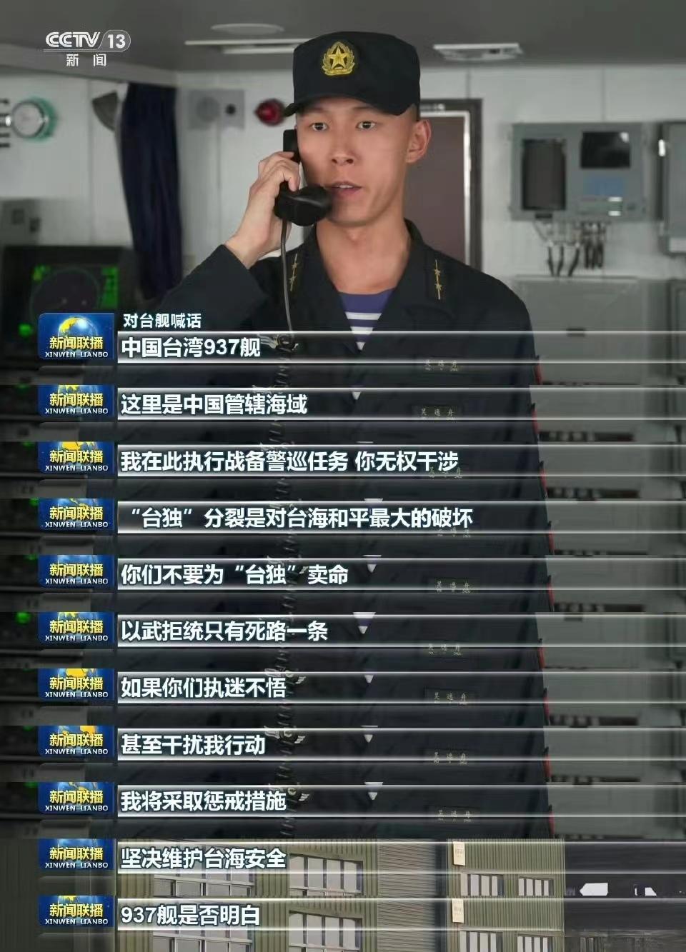 5月23日至24日,中国人民解放军东部战区组织战区陆军、海军、空军、火箭军等兵力,位台岛周边开展“联合利剑—2024A”演习。24日7时45分开始,东部战区海军多个驱护舰编队向台岛周边海域多个方向高速机动,塑造全向围岛抵近进逼之势。下午,东部战区持续位台岛周边海空域开展对海突击、防空反潜、模拟打击等科目训练,检验战区部队多域协同、联合打击等实战能力。现场,解放军喊话台舰:“‘台独’分裂是对台海和平最大的破坏,你们不要为‘台独’卖命,‘以武拒统’只有死路一条。”
