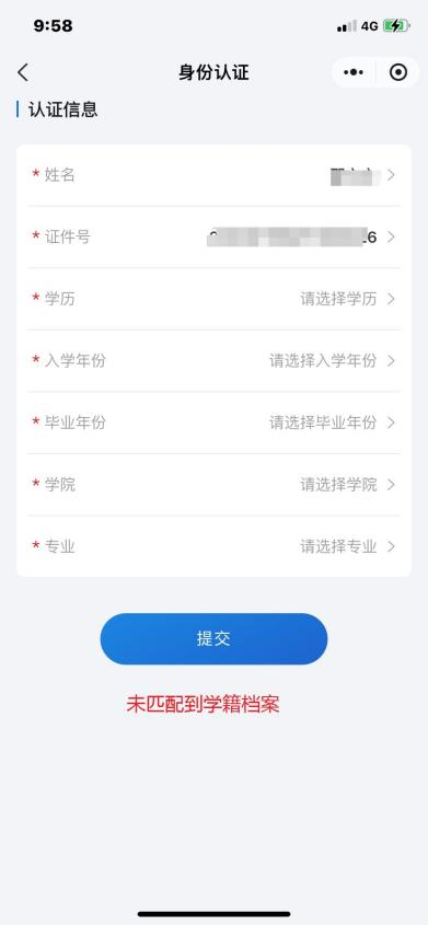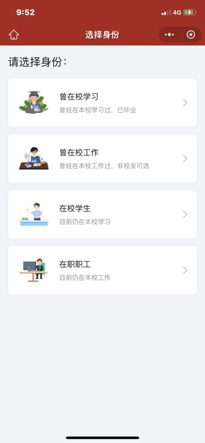 在“校友身份认证”页面选择校友类型,进入相应的表单填写页面,如填写的信息与认证规则匹配则直接认证通过。如不匹配,也请不要着急,补充上传毕业证、学位证、学生证或工作证等证书,进入人工审核流程。