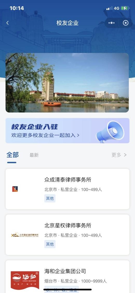 校友可通过平台的“校友企业”服务,发布求职招聘、商务合作、互帮互助、寻访师生等各类资源信息,查询校友企业,实现校友间资源信息的共享与对接,助力校友互联。