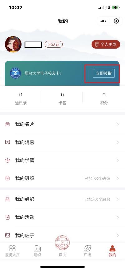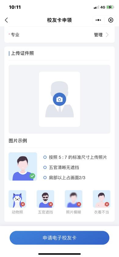 校友通过身份认证后,点击【我的】→【立即领取】进入电子校友卡申领页面→上传证件照→点击【确认领取】→专属电子校友卡领取成功。