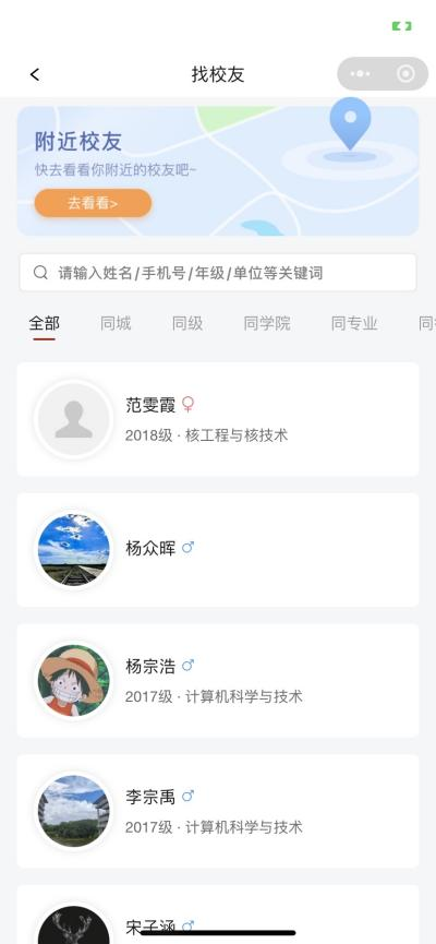 校友可通过平台查询附近校友、同行校友、同兴趣校友、同班同学、同专业校友、同年级校友等。