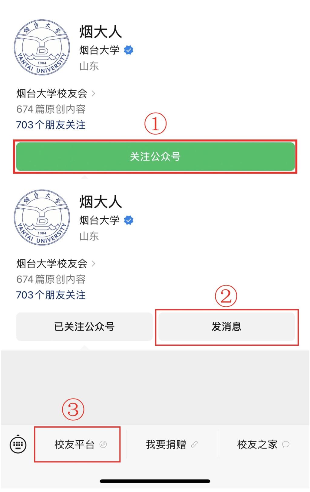 请校友关注“烟大人”微信公众号,按照下图“①②③”流程在导航栏中选择“校友平台”即可直接进入“91吃瓜