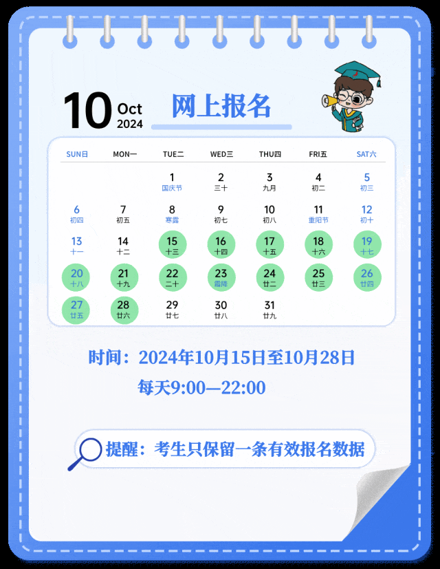 网上报名时间为2024年10月15日至10月28日,每天9:00—22:00。网上预报名时间为2024年10月9日至10月12日,每天9:00—22:00。预报名成功后,报名有效。