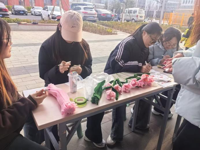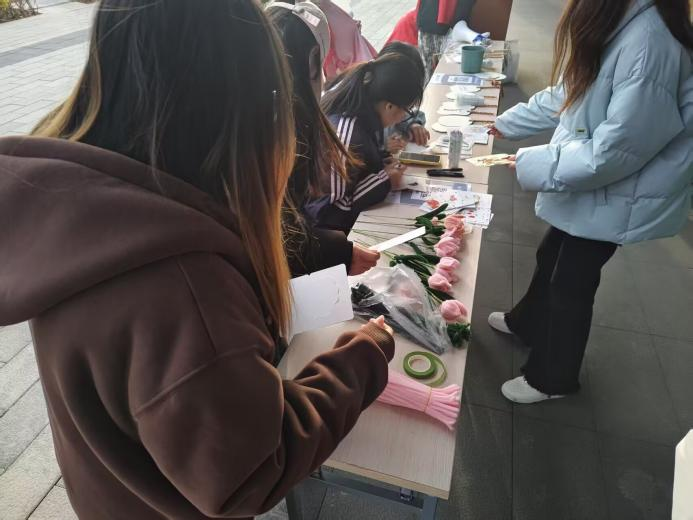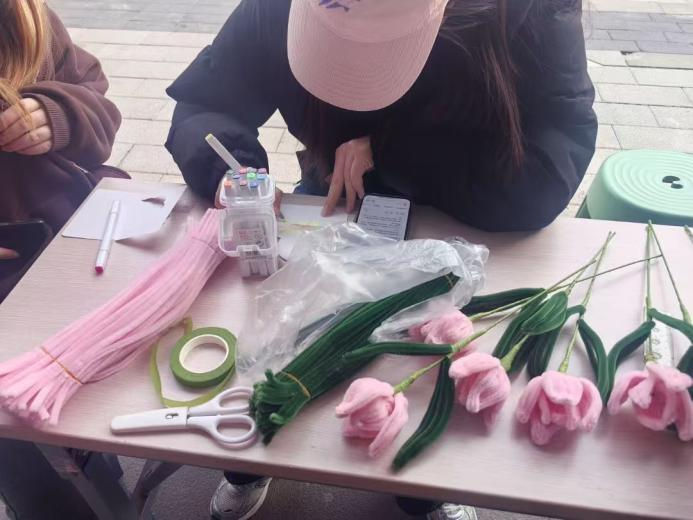 在创意手工区,同学们在志愿者的指导下,用彩色扭扭棒制作出栩栩如生的花朵,或以漆艺技法绘制出纹样精美的漆扇。与此同时,在寄语区,同学们纷纷执笔写下暖心话语,这些承载着温度的贺卡将与卫生物资一同送往山区。