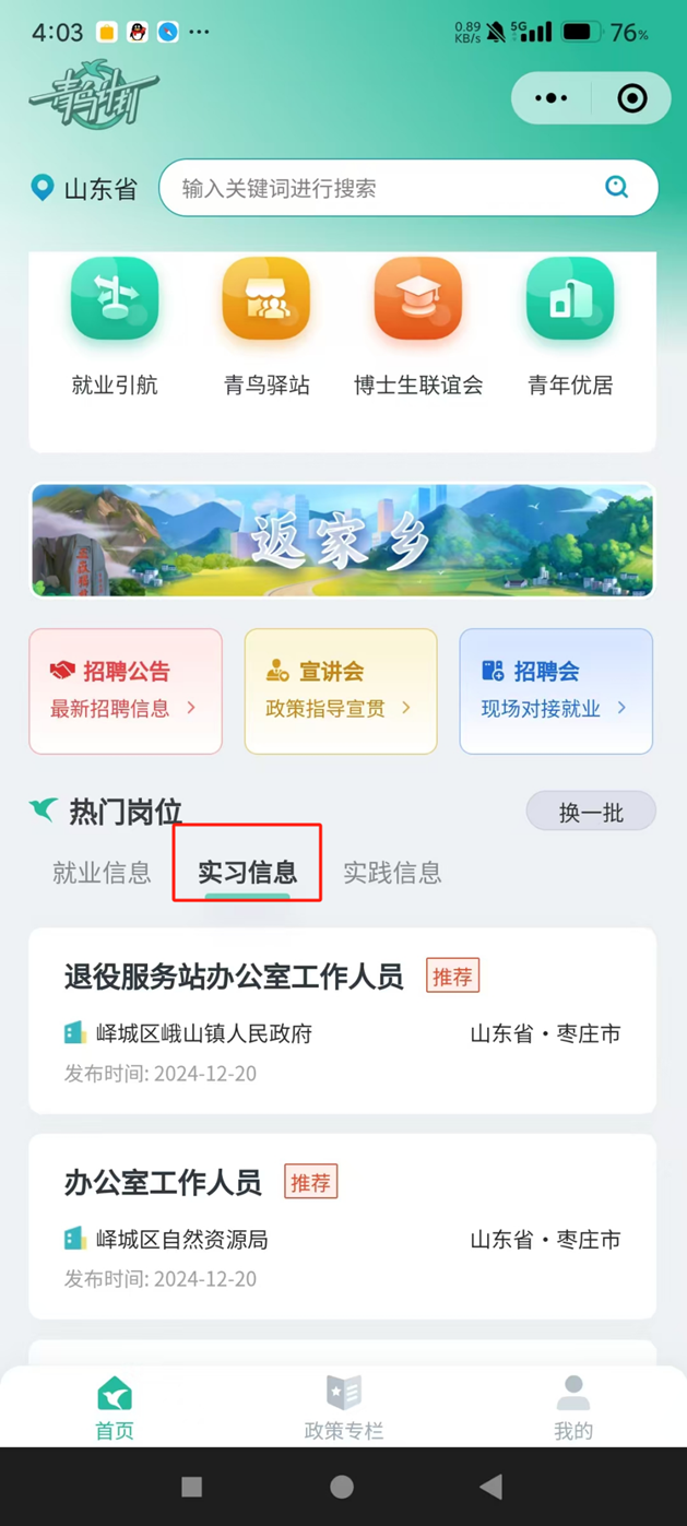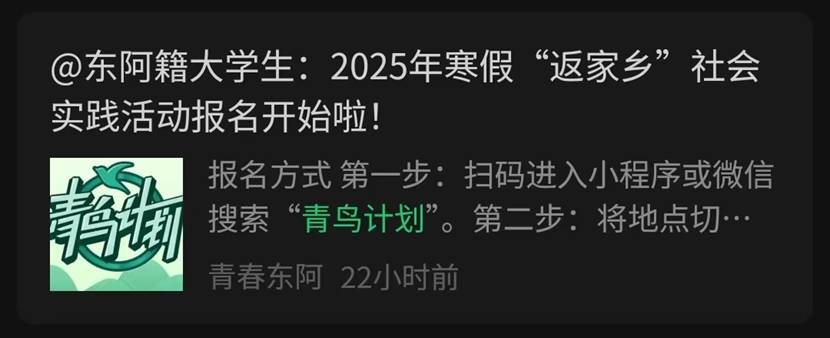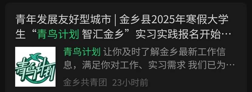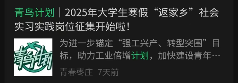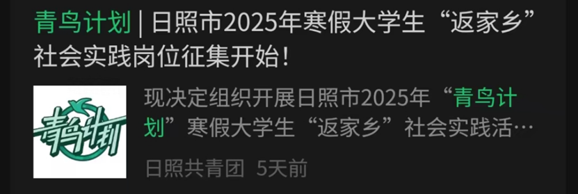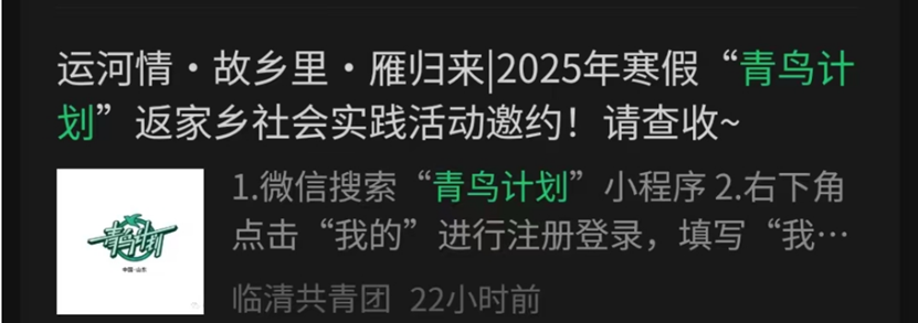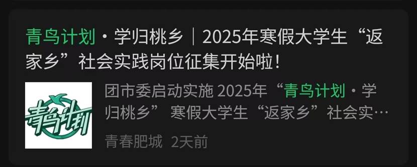 部分地区会通过团委公众号发布“返家乡”“三下乡”“青鸟计划”系列推文,介绍活动内容及要求,公布实习实践岗位。可以通过关注地方团委公众号,在规定时间按照要求报名参与寒暑期“青鸟计划”实习实践活动。