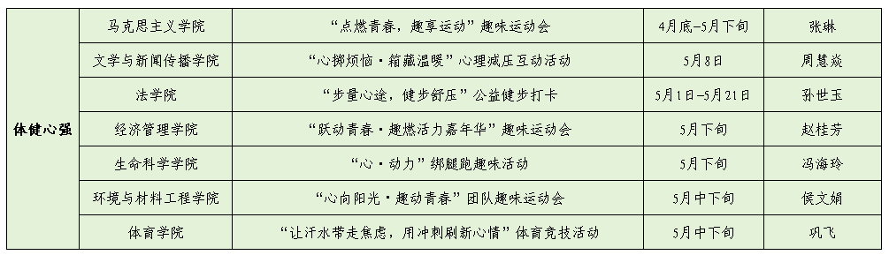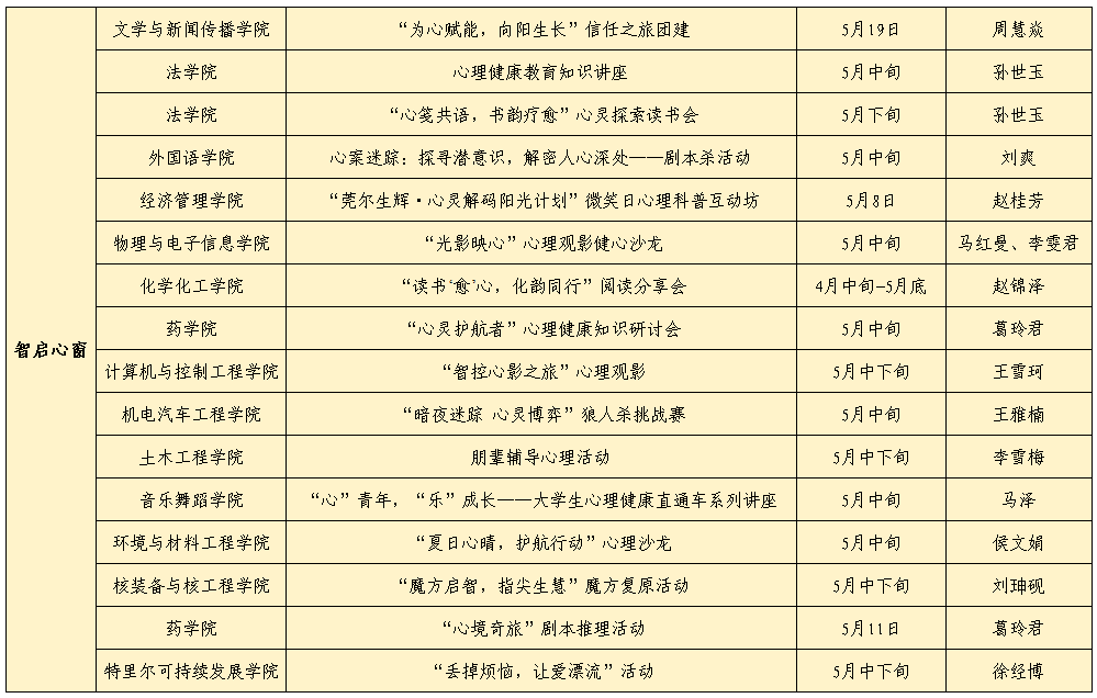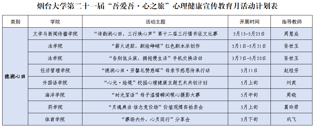 心理健康教育指导中心组织,协同各学院二级心理辅导站共同开展,分为德润心田、智启心窗、体健心强、美育心光、劳悦心志五个模块,欢迎大家积极参与。