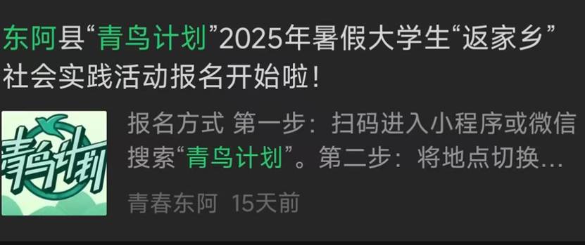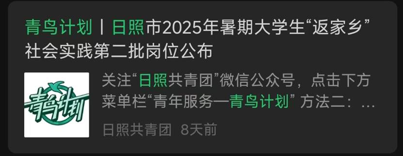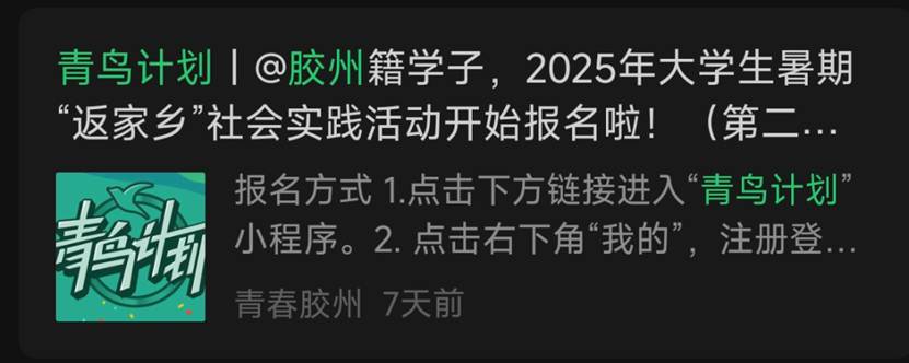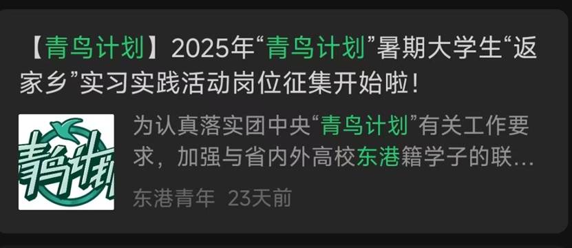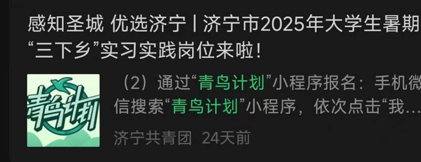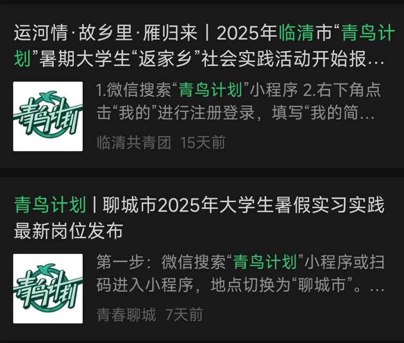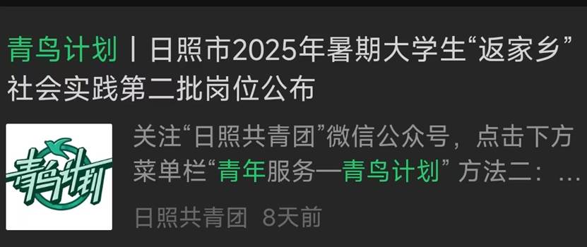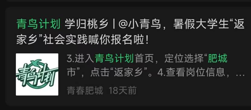 部分地区会通过团委公众号发布“返家乡”、“三下乡”、“青鸟计划”系列推文,介绍活动内容及要求,公布实习实践岗位。可以通过关注地方团委公众号,在规定时间按照要求报名参与寒暑期“青鸟计划”实习实践活动。