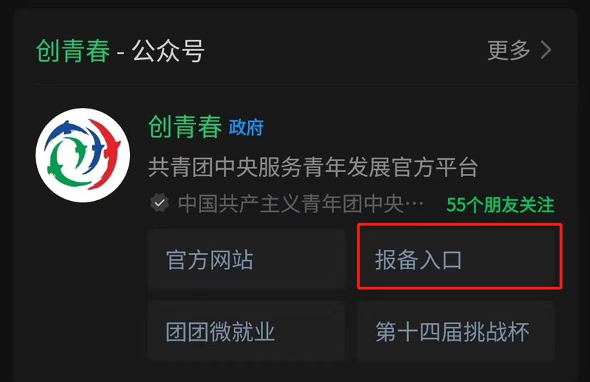 1.关注【创青春】微信公众号→选择【报备入口】选项。