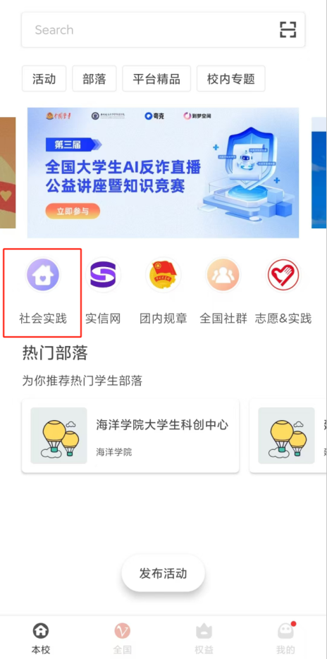 3.进入APP页面点击中间部分【社会实践】选项。