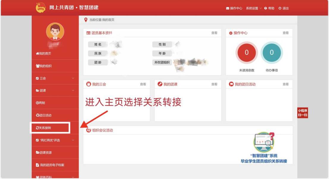 页面左侧列表点击【关系接转】,选择申请转入组织及接转原因,填写基本信息与情况并提交,等待原学校团委管理员审核。