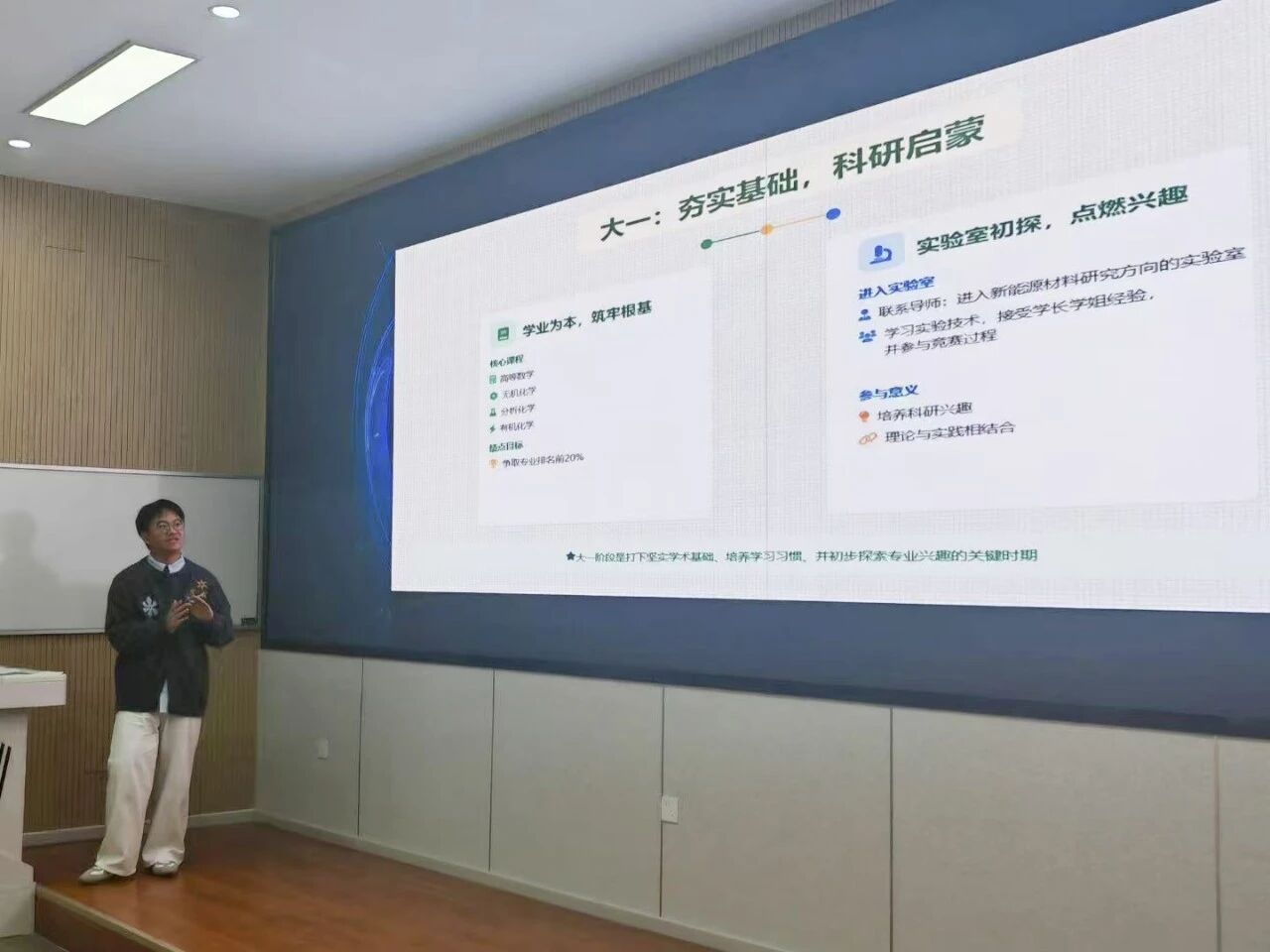 决赛现场,选手们围绕“四年专业成长蓝图”的主题,结合学院专业特色展开精彩演讲。他们以“化学工程与工艺”专业课程体系为基础,规划了“课程学习-实验实践-科研创新”三阶成长路径,各位选手的演讲既体现对专业的深度理解,又展现出了详细的成长规划,赢得评委与在场同学的阵阵掌声。