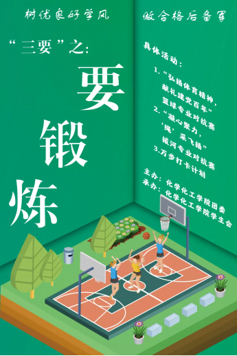 化学化工学院为进一步加强学风建设和校园文化活动建设,在落实“三无”建设工程的基础,倡导“三要”建设工程,倡导同学们“要晨读,要锻炼,要热爱专业”。为提高同学们的锻炼积极性,增强同学们之间的凝聚力,学生会体育部组织“化院篮球专业对抗赛”“拔河专业对抗赛”“万步打卡计划”三大活动,丰富同学们的体育锻炼。