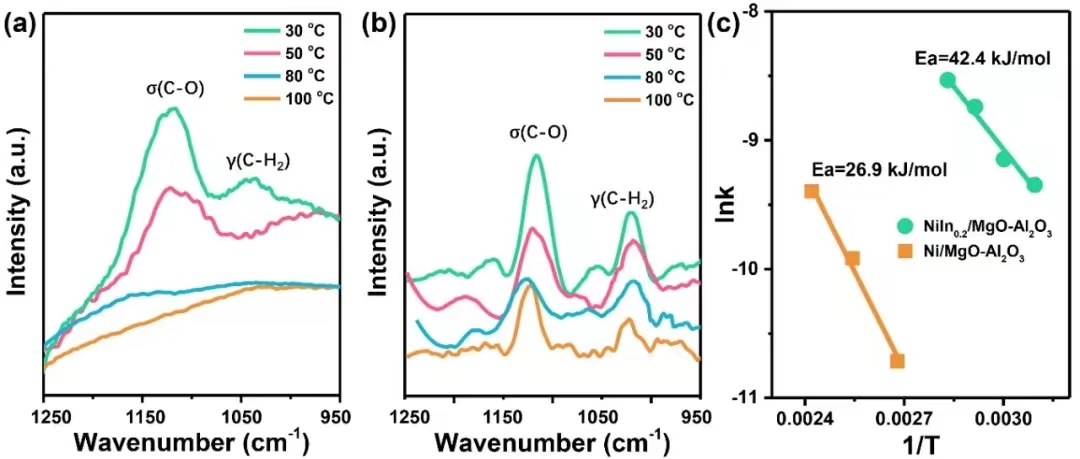 Figure 6.FT-IR spectra of FOL desorption from (a) NiIn0.2/MgO-Al2O3and (B) Ni/MgO-Al2O3within a temperature range of 30-100 °C. (c) Plot of lnkas a function of 1/T over NiIn0.2/MgO-Al2O3and Ni/MgO-Al2O3, derived from FOL reaction rates vs reaction time.