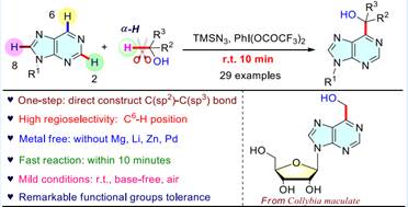 孙凯副教授和鲁东大学于明武副教授两个团队合作,利用PIDA/TMSN3氢原子转移体系,共同开发了一种高度区域选择性的羟烷基化反应,在室温下使用醇作为羟烷基化试剂,在10分钟内合成 C6-羟基烷基化嘌呤和嘌呤核苷,反应无需金属、光照或者惰性气体保护。该研究成果发表于美国化学会的有机快报(Org. Lett., 2022, DOI:10.1021/acs.orglett.2c01680)。