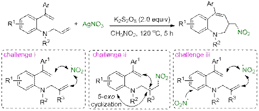 N-杂环化合物是合成和医药化学中常见的分子骨架,并且是非常有价值的合成前体,可以进一步转化为一系列有价值的结构单元。此外,在世界销售排名前100的药物分子中,含氮杂环占比接近一半。因此,N-杂环的有效构建一直是有机合成研究的热门领域。目前,采用硝基自由基诱导的加成环化制备含硝基7元氮䓬的方法尚无报道。近日,91吃瓜