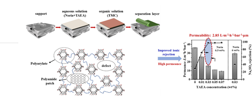 赵玉潮教授课题组利用大环分子作为主体构建单元,基于界面聚合反应,通过 “打补丁”策略制备了聚芳酯-聚酰胺复合纳滤膜。大环分子内部空腔有效降低了水分子传质阻力,纳滤膜渗透率达2.85 L·m−2·h−1·bar−1·μm,硫酸钠截留率高于96%,且具有优良的耐压性和长期稳定性。
