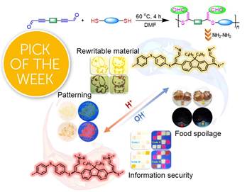 环境友好高分子团队与华南理工大学秦安军教授团队合作,建立了一种无催化醛基活化内炔与巯基的点击聚合,成功制备一系列多功能聚硫醚。利用该聚硫醚结构中的高反应性醛基及荧光芴基,不仅可实现肼的高灵敏、选择性检测;而且反应新生成亚胺键上的氮原子在不同酸碱环境中会发生可逆的质子化/去质子化反应,由此产生的分子内电荷转移过程使得聚合物光物理性质发生系列变化,实现其在多色图案化、复写材料、四重信息加密及食品保鲜监测等多场景的应用。