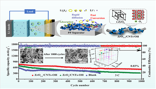 材料电化学过程与技术团队借助-OH官能团的作用,采用氢刻蚀法成功制备了具有丰富氧空位的四方相ZrO2−x/CNTs-OH。通过电化学实验辅助第一性原理计算发现,氧空位和纳米结构可以有效的调控复合材料的电子结构,提高材料导电性,实现对多硫化物氧化还原反应的催化作用。同时,四方相ZrO2−x有助于锂离子在电极表面的快速传输,CNTs-OH和ZrO2−x之间复合有利于电子在界面处的快速转移。因此,该复合材料改性隔膜时,表现出优异的电化学性能。这种催化策略,不仅可以应用于锂硫电池体系,也可应用于其他电池体系和超级电容器中。