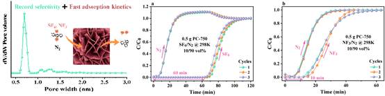 徐秀峰教授课题组较早开展了SF6、NF3等新型温室气体的减排研究,利用化学分解方法(催化水解或无水分解)将这些气体转化为低害物质。相比之下,将SF6、NF3从工业废气中吸附分离并回收再利用是一种更有效的资源化处理方法。为此,本课题组以柠檬酸钾为原料,经一步碳化活化,调控纳米片状炭基吸附剂的孔结构和表面性质,增强了吸附剂与SF6、NF3分子的相互作用,提高了吸附剂在常温常压下对SF6的吸附量(4.09 mmol·g-1)和吸附选择性(10%SF6/90%N2的分离比436.4),对10%NF3/90%N2的分离比达到61.4,优于文献报道的吸附剂。研究结果以“Highly-efficient separation of SF6/N2 and NF3/N2 with record selectivity on one-step synthesized carbon nanosheet”为题,发表在化工分离领域权威期刊《Separation and Purification Technology》。作为资源化减排SF6、NF3废气的一种有效方法,该工作丰富了对吸附分离含氟温室气体科学规律的认识。