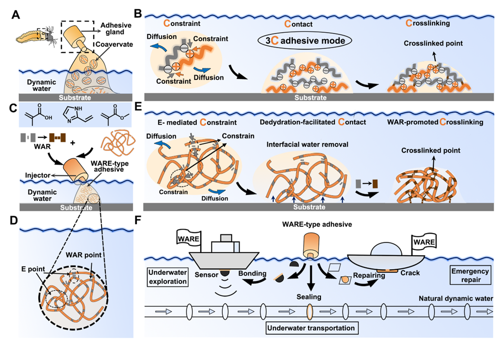 刘洪亮教授团队受海洋固着生物“3C”粘合模式的启发,将高分子的缠结性与溶剂响应性结合,提出了一种水响应性缠结(WARE)的普适性概念,并据此构建了一系列动态水环境适用的水下粘合剂。结果显示,此类粘合剂可以通过仿3C粘合流程,即分子缠结介导的分子损失抑制,充分去水化促进的水下界面接触以及溶剂响应引发的水下高效交联,从而完成动态水环境中的粘合过程,并在动态水环境中实现高强水下粘合。此外,由于简单的合成策略及独特的粘合模式,WARE粘合剂还表现出一系列适用于实际应用的性能,如:大量生产能力,长期储存性,按需解粘附性及循环利用性。WARE粘合剂凭借其优异的动态水中粘合能力,可以简化水下探测过程,修复破损船只以及封堵泄漏的水下运输管道,具有广阔的应用前景。