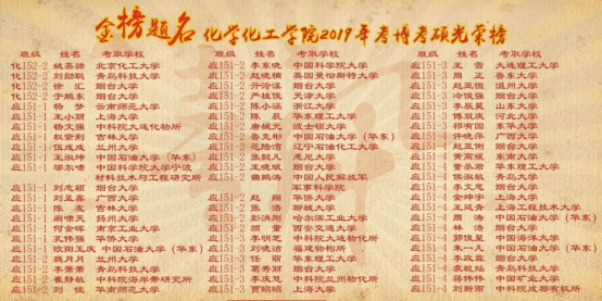希望所有考上研究生的同学们都能够在未来学业中学有所成,在各自研究的领域中做出贡献,为烟大争光,为化院争彩。希望所有正在准备考研的同学们能够持之以恒,坚持到底,祝福未来金榜题名。希望所有大一、大二的同学们以此为榜样,脚踏实地,好学力行,梦想成真!