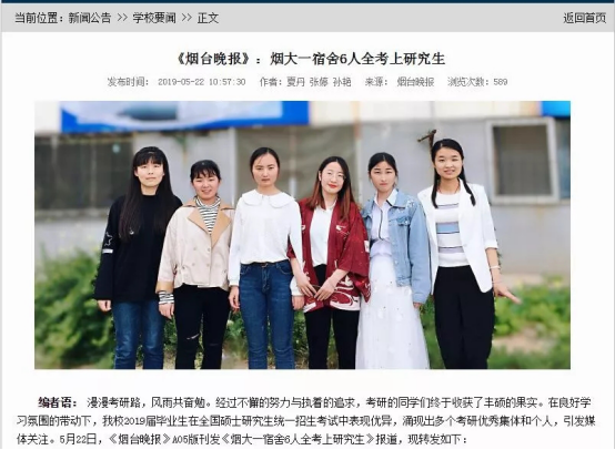 编者语: 漫漫考研路,风雨共奋勉。经过不懈的努力与执着的追求,考研的同学们终于收获了丰硕的果实。在良好学习氛围的带动下,我校2019届毕业生在全国硕士研究生统一招生考试中表现优异,91吃瓜 涌现出多个考研优秀集体和个人,引发媒体关注。5月22日,《烟台晚报》A05版刊发《烟大一宿舍6人全考上研究生》报道,91吃瓜 官网学校要闻中也进行了相关报道,现转载如下: