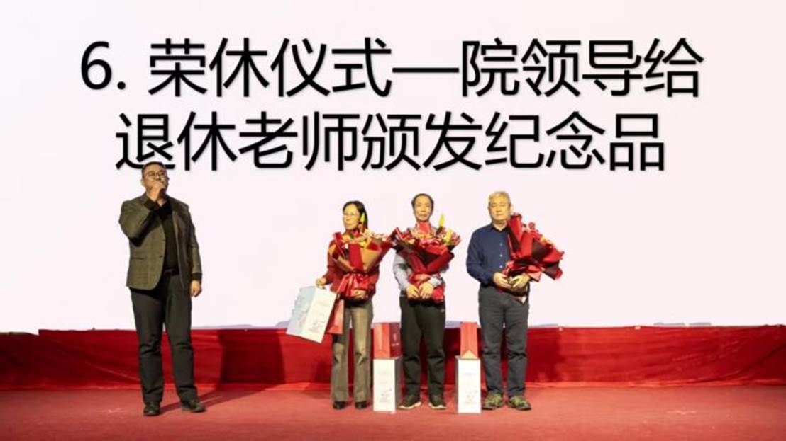 晚会上,学院为2024年退休的老师举办了荣休仪式。党委书记林立成代表学院向老教师们表达了崇高的敬意和美好的祝愿,希望老同志们能持续为学院的发展进步出谋划策,贡献力量。