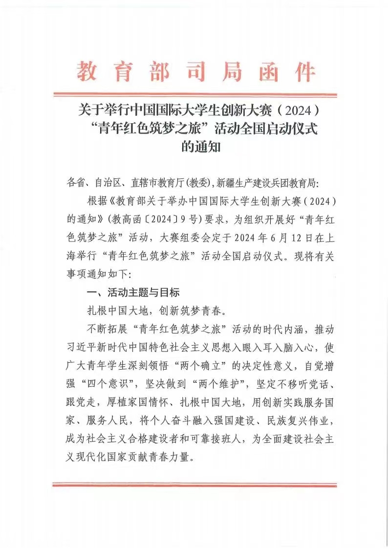 关于举行中国国际大学生创新大赛(2024)“青年红色筑梦之旅”活动全国启动仪式的通知