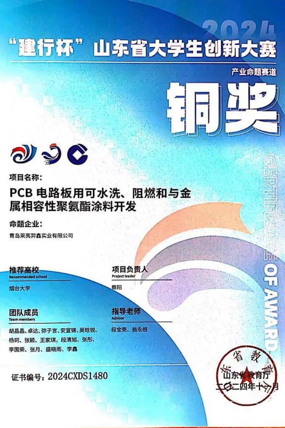 曾获得山东省大学生高分子材料创新设计大赛二等奖、中国国际大学生创新大赛银奖、建行杯”山东省大学生创新大赛铜奖、第五届全国高分子材料创新创业大赛铜奖等奖项。