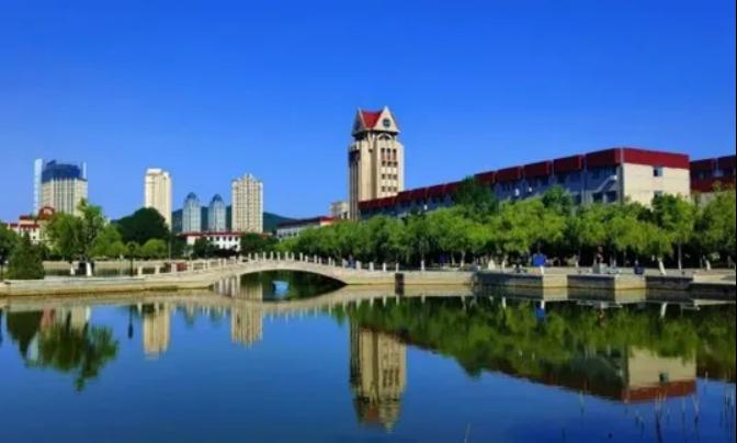 烟台大学北校区三元湖、玉带桥与钟楼。