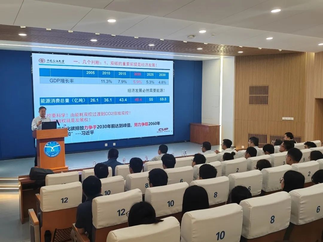访问期间,徐春明院士作了题为《双碳战略下能源化工发展思考与实践》的学术报告,重点围绕“碳达峰、碳中和”国家战略目标,深刻分析石油化工学科与行业的发展趋势,详细介绍绿氢、绿电、储能等领域科技进展情况。化学化工学院百余名师生参加报告会。