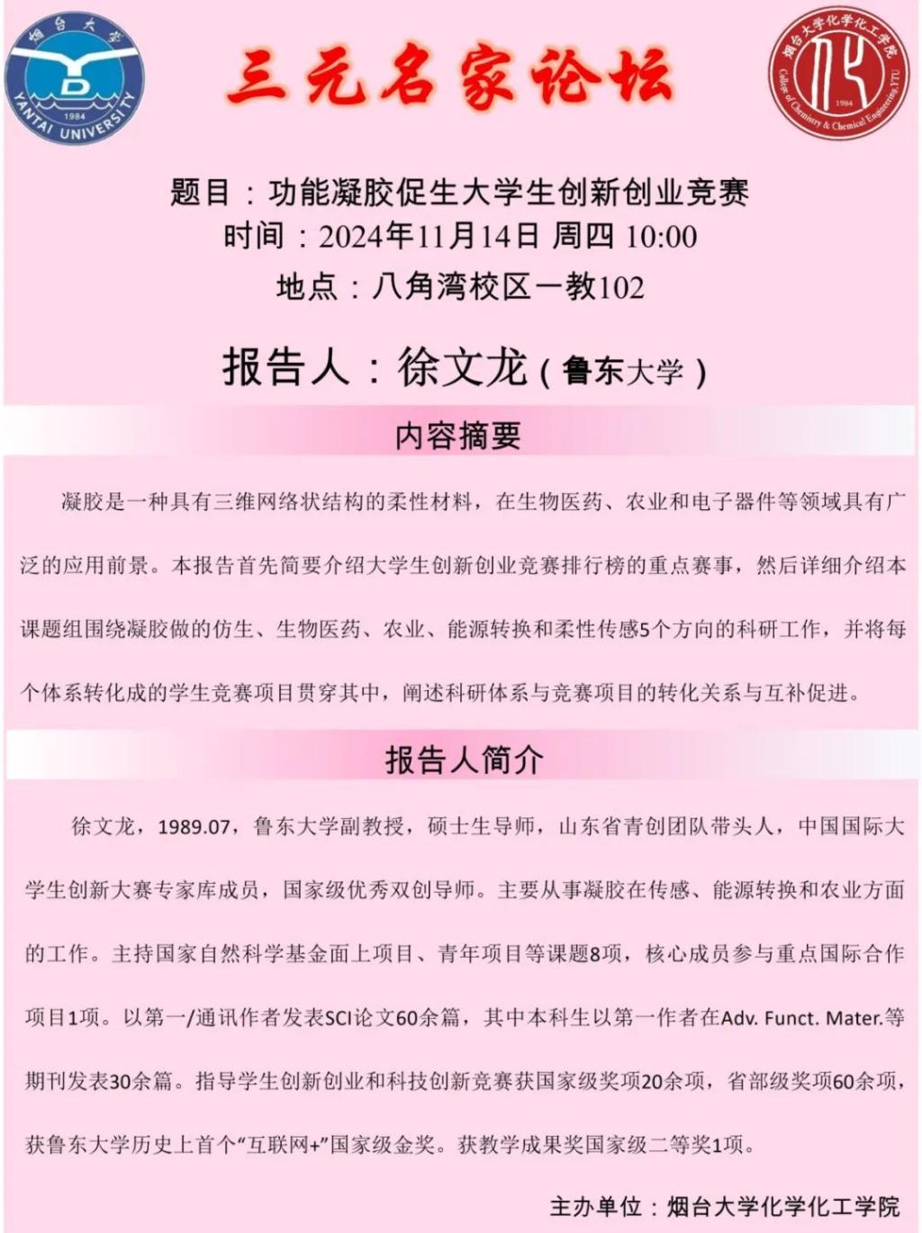 “化小水”的创新创业、三元名家论坛(化院)|《功能凝胶促生大学生创新创业竞赛》,主讲:徐文龙副教授