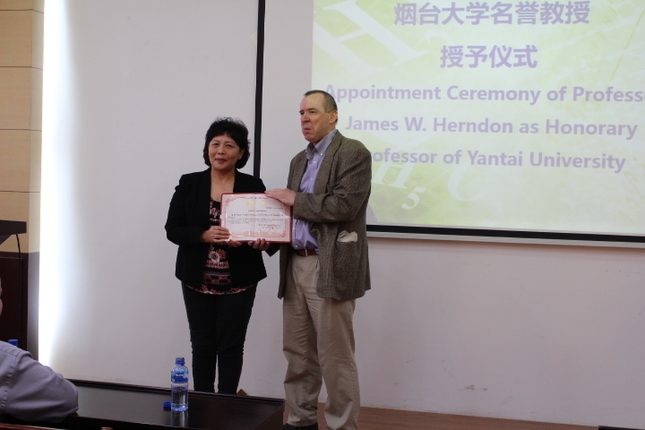 外事处长张西俊主持,化院院长任万忠向出席人员介绍了来自美国新墨西哥州立大学的Herndon教授简历及学术成就,韩晓玲副校长为Herndon教授颁发聘任证书。