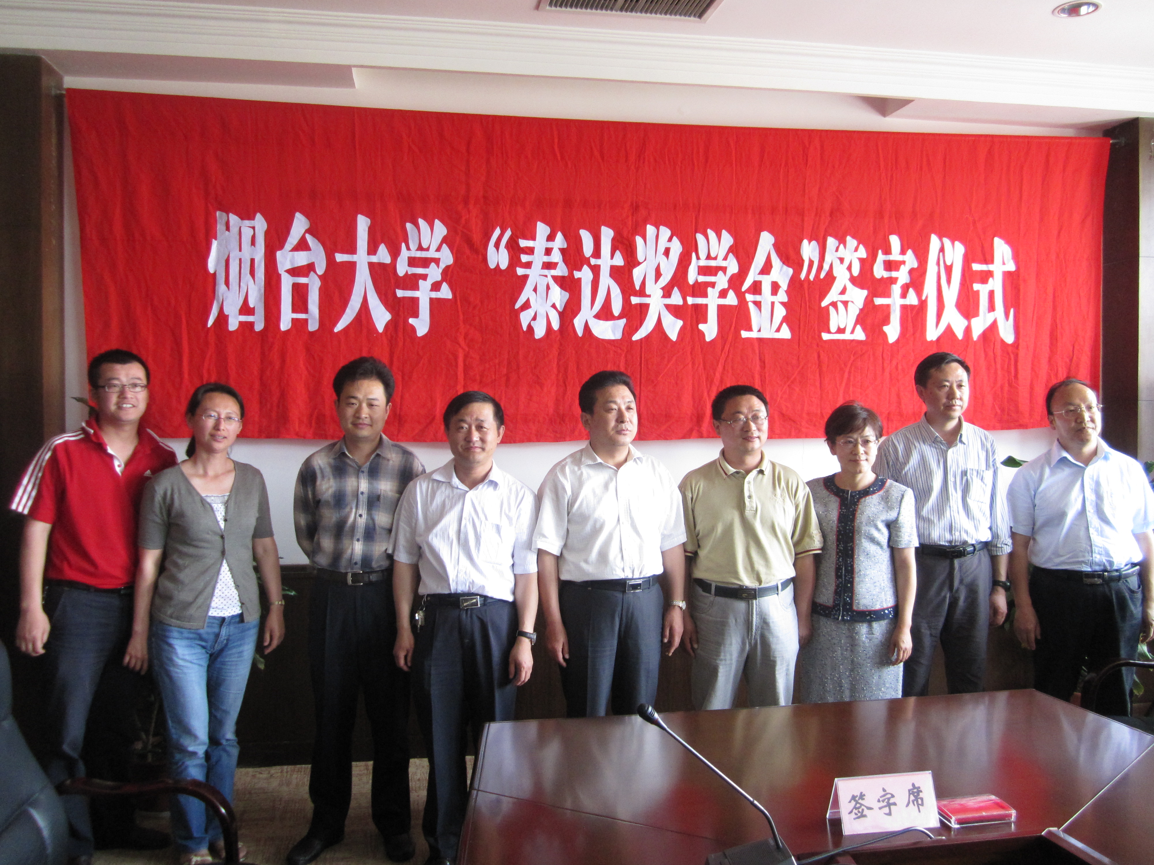 孙祥斌副校长代表学校致辞,他对烟台泰达集团宋华西董事长一行的到来表示热烈欢迎,他指出:第一,学校非常欢迎泰达集团到校设立奖学金,同时也非常感谢集团为我校学生提供的奖励和资助。第二,学校非常重视校企合作这项工作,一直努力为双方提供产、学、研、用等各方面合作的机会和条件。第三,希望我校学生能努力学习,饮水思源,以更好的成绩回报社会。最后,与会代表及学生代表一起合影留念。