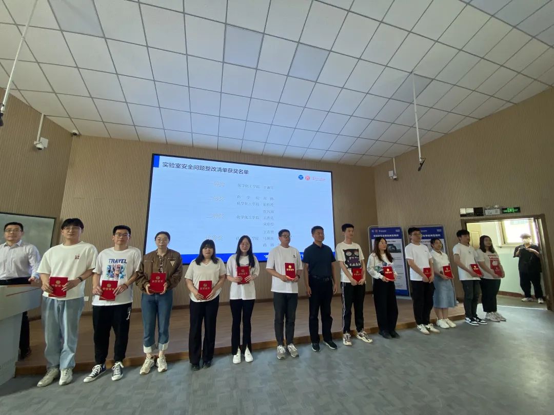随后,李文佐院长、林立成书记、梁入文副处长为本届“实验室安全月”子活动——实验室安全宣传海报、视频创意设计大赛,实验室安全问题整改清单征集、评比活动,实验室安全知识答题赛进行颁奖。获奖同学化学化工学院2021级研究生褚福浩激动地说:“我们组队参加了视频设计大赛,在参赛过程中我们更加关注实验室安全细节,希望更多同学能够关注到我们的视频,注意实验安全,做好个人防护。”