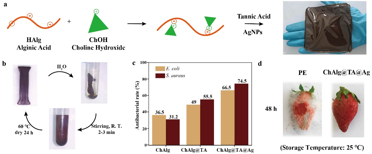 武文娜、张涛、研究生张雪等通过引入化学非共价相互作用,将胆碱阳离子通过静电相互作用力固定在海藻酸聚合物上,制备了具有良好循环性的自支撑抗菌薄膜【图1】。此外,添加单宁酸和银离子可以显著提高薄膜的机械性能和抗菌性能,他们以草莓为例验证了其优异的抗菌保鲜功能(Int. J. Biol. Macromol.2024,265, 130936)。