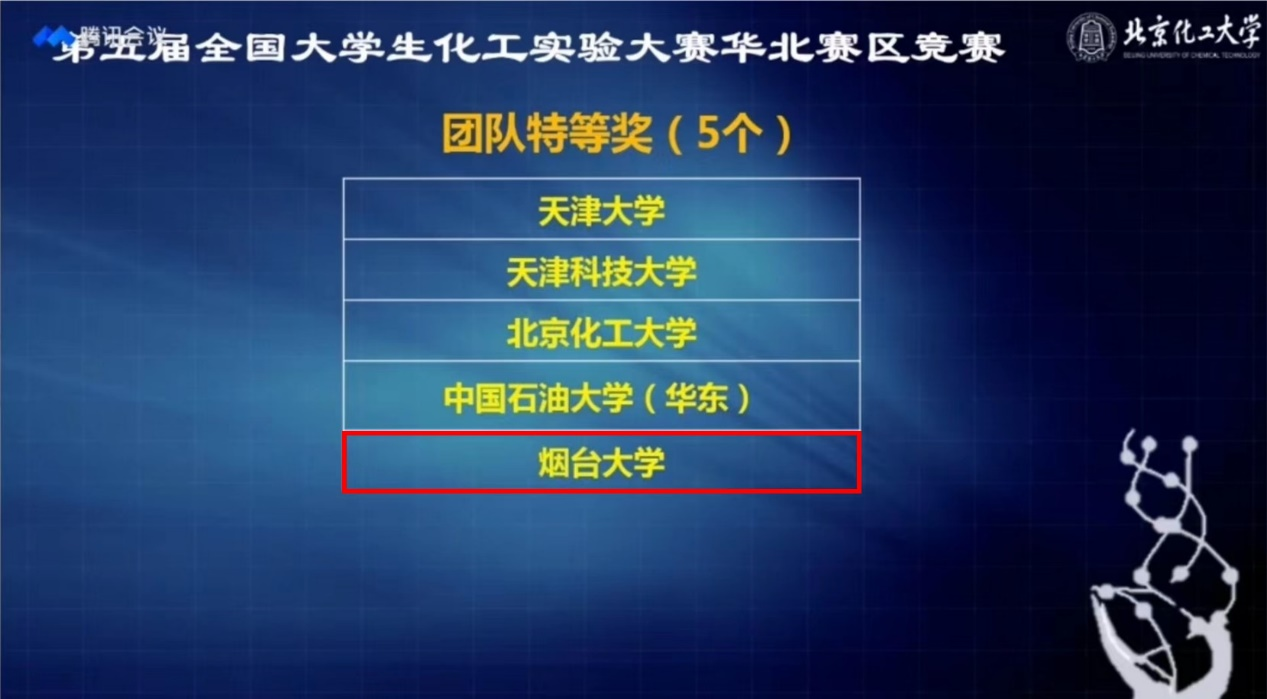 2022年7月10日至13日,由中国化工教育协会主办,北京化工大学承办的“第五届全国大学生化工实验大赛华北赛区竞赛”顺利举行。在张庆、殷国俊老师的带领下,烟台大学化学化工学院2019级化学工程与工艺专业学生刘野淳子、岳子芊、张金红勇夺华北赛区团队特等奖,并晋级全国总决赛。烟台大学连续5年参加该大赛,曾多次荣获一二等奖,今年终获突破。