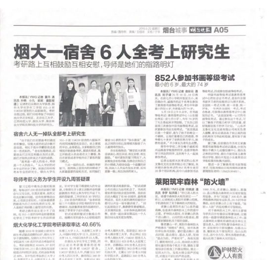 编者语: 漫漫考研路,风雨共奋勉。经过不懈的努力与执着的追求,考研的同学们终于收获了丰硕的果实。在良好学习氛围的带动下,我校2019届毕业生在全国硕士研究生统一招生考试中表现优异,91吃瓜 涌现出多个考研优秀集体和个人,引发媒体关注。5月22日,《烟台晚报》A05版刊发《烟大一宿舍6人全考上研究生》报道,91吃瓜 官网学校要闻中也进行了相关报道,现转载如下: