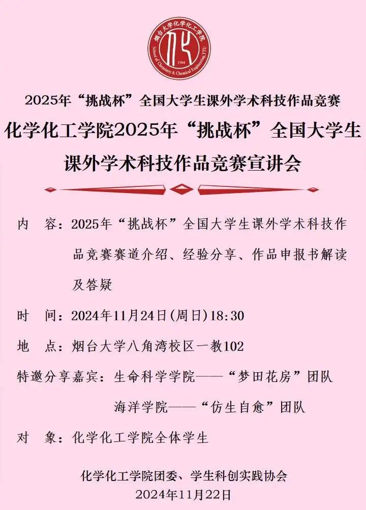 “挑战杯”全国大学生课外学术科技作品竞赛(以下简称“挑战杯”竞赛)至今已成功举办十八届。竞赛创办以来,始终坚持“崇尚科学、追求真知、勤奋学习、锐意创新、迎接挑战”的宗旨,在推动广大高校学生参与学术科技实践、发现和培养创新型人才、深化高校素质教育等方面发挥了积极作用,集中展示了高校创新教育成果,体现了鲜明的导向性、示范性和群众性,在高校和社会上产生了广泛、良好的影响。为进一步引导学院学生崇尚科学、参与科创,紧密围绕创新驱动发展战略,服务国家经济社会发展大局,扎实做好第十九届“挑战杯”竞赛备赛工作,学院定于2024年11月24日(周日)举办化学化工学院2025年“挑战杯”大学生课外学术科技作品竞赛宣讲会,现将有关事宜通知如下: